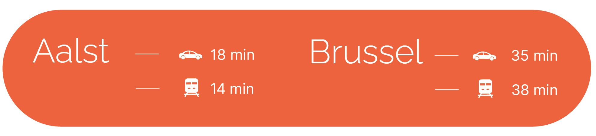 In minder dan 20 minuten sta je in Aalst, en in ongeveer 40 minuten in hartje Brussel. Hier geniet je van de nabijheid van de stad, zonder de stadse prijzen.